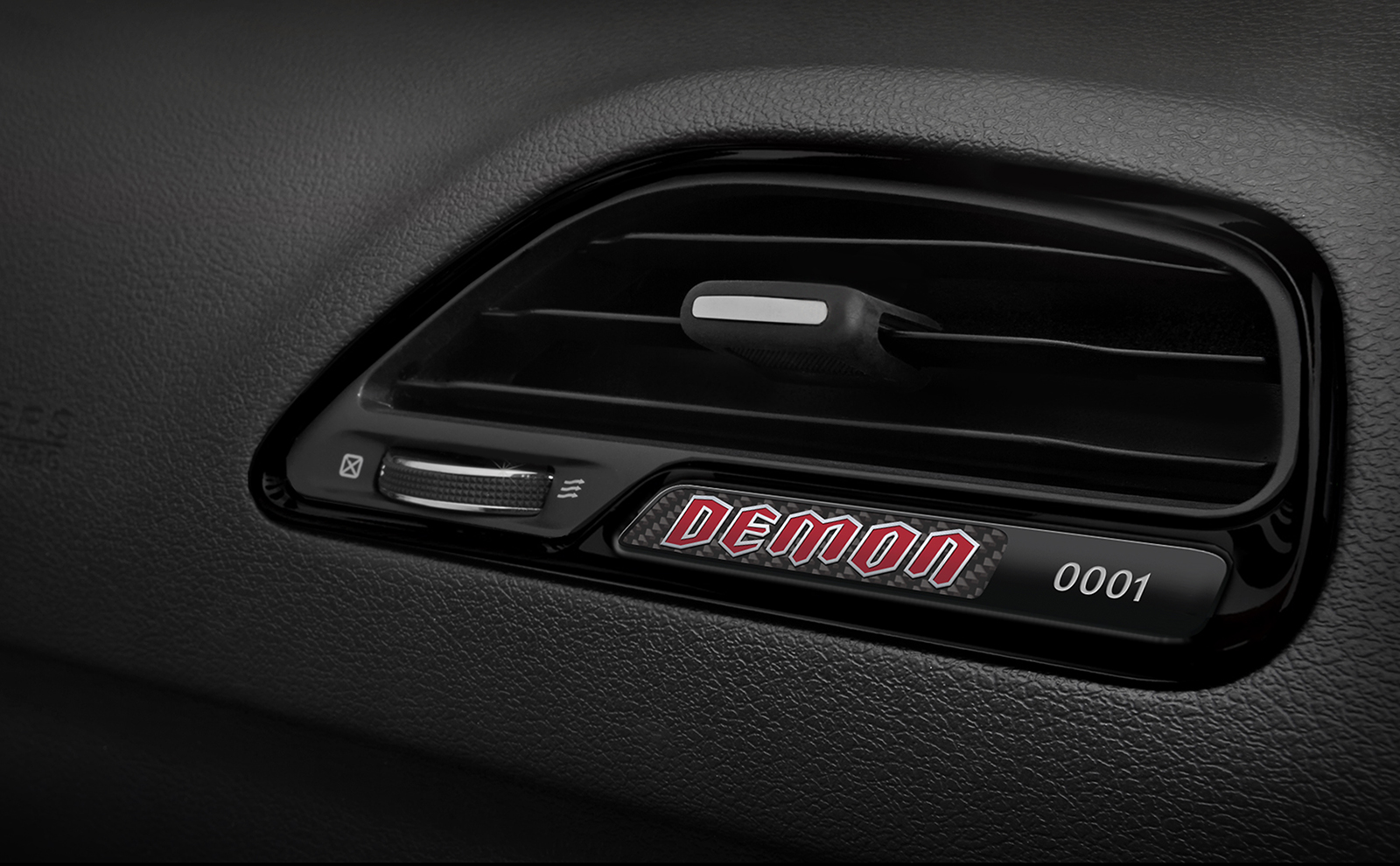 Gloss Black bezels are featured throughout the 2018 Dodge Challenger SRT Demon’s interior. Passenger side IP bezel features carbon fiber badge, laser-etched with production sequence number.
