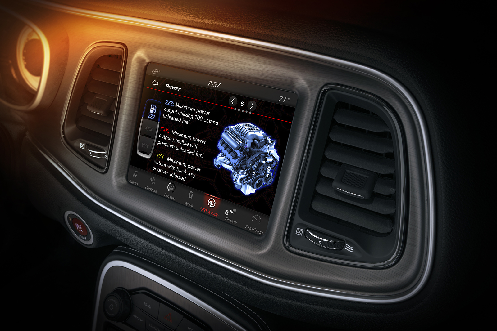 The 2018 Dodge Challenger SRT Demon includes a detailed power page that explains each level drivers can select for the engine from SRT Demon Mode Pages, as shown on the 8.4-inch Uconnect touchscreen.